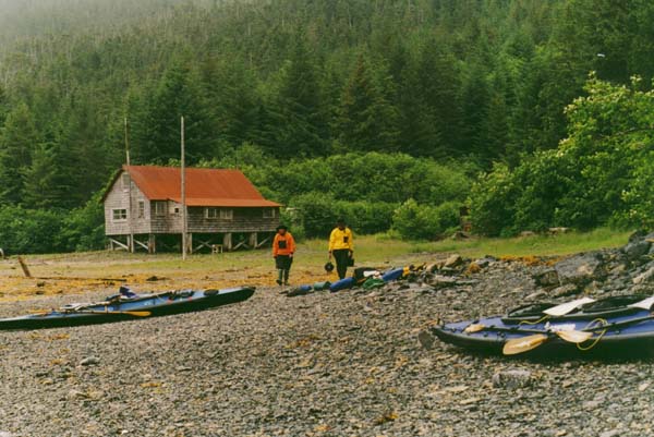 So we were going to Sitka, but where would we paddle? We know several people who have paddled there, and it was soon clear to us that all signs pointed to the West Coast of Chichagof Island, which is linked via Peril Strait to Baranof Island, where Sitka is situated. We had made previous arrangements for a powerboat to transport us to the north end of Khaz Peninsula. Charlie picked us up on July 26th and we had a nice time with him. 2½ hours later, at 25 knot speed, he dropped us off. He would come back 8 days later to bring us back. The weather in Sitka had been glorious, but, as Charlie backed out to return to Sitka, the rain started. Or maybe I should say the mist. We were in the clouds, and it misted or drizzled almost every day. Usually we had about three or four hours a day without rain. We were glad that we were well prepared with raingear and tarps; they certainly were well used.