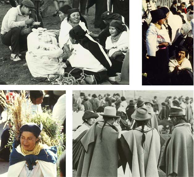The Otavalan men are just as fascinatingly beautiful. They wear white pants, and I amaze at how they are always fresh and clean. The pants come to between the knee and the ankle, and their sandals are an off-white woven string. They wear heavy wool ponchos of an elegant style, nicely finished with collar and edging. These are draped to fold back over the shoulders unless it's real cool out, when they're left down to cover their full arms. When folded back, the inside is shown off, frequently a different color or a contrasting solid to plaid. The man always wears a felt hat ... somewhat of a "bowler" style (women frequently wear this hat, too) -- and he has long hair in a beautiful braid, often reaching to the waist.