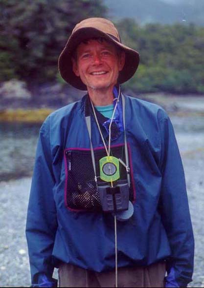 So we were going to Sitka, but where would we paddle? We know several people who have paddled there, and it was soon clear to us that all signs pointed to the West Coast of Chichagof Island, which is linked via Peril Strait to Baranof Island, where Sitka is situated. We had made previous arrangements for a powerboat to transport us to the north end of Khaz Peninsula. Charlie picked us up on July 26th and we had a nice time with him. 2½ hours later, at 25 knot speed, he dropped us off. He would come back 8 days later to bring us back. The weather in Sitka had been glorious, but, as Charlie backed out to return to Sitka, the rain started. Or maybe I should say the mist. We were in the clouds, and it misted or drizzled almost every day. Usually we had about three or four hours a day without rain. We were glad that we were well prepared with raingear and tarps; they certainly were well used.