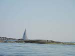 Vi började komma längre in i skärgården till mer skyddade områden - inte för att spelade någon roll en så här lugn och vacker dag - och skären blev trädbevuxna holmar och öar. Det var dock lätt att hitta små klippor ute i vattnet. På bilden syns en av dessa med vilande måsar.